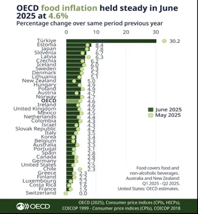 2025 yılı enflasyon rakamı 2020 sonrası dönemin en düşük rakamı olması yönüyle olumludur. Ancak çift haneli rakamlarda bulunduğu seviye açısından bakıldığında Türkiye hâlâ dünyadaki en yüksek enflasyon oranına sahip ülkelerden biri durumundadır. Grafik 2’de görüldüğü üzere, 2025 ortaları itibariyle gıda enflasyonu açısından OECD ülkeleri arasında açık ara birinci sırada olan Türkiye’de enflasyon OECD ortalamasının (%4,6) tam 6,5 katıdır (%30,2).